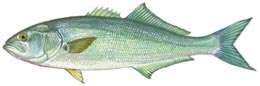Bluefish are the only members of the family, Pomatomidae, and are closely related to jacks, pompanos, and roosterfish. Bluefish are greenish blue with a sturdy compressed body, a large head, and sharp, triangular teeth. They are found throughout the world and are a migratory species that range from Nova Scotia to Florida off the Atlantic coast and can be found in the Gulf of Mexico from Florida to Texas. Along the east coast, bluefish migrate northward in the spring and summer and southward in the fall and winter. During the summer, bluefish are concentrated from Maine to Cape Hatteras, North Carolina and during the winter, most tend to be offshore and south between Cape Hatteras and Florida.